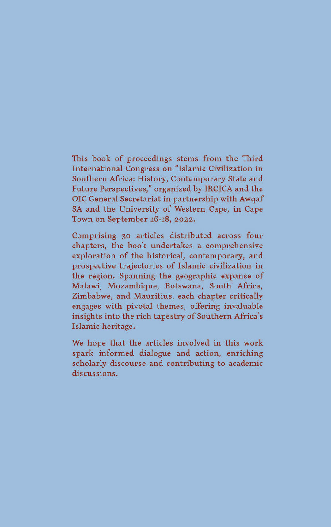 Ce livre contient les articles du Troisième Congrès international sur « La civilisation islamique en Afrique australe : histoire, situation contemporaine et perspectives d’avenir », organisé par l’IRCICA et le Secrétariat général de l’OCI en partenariat avec la Fondation Awqaf d’Afrique du Sud (Awqaf SA) et l’Université du Cap-Occidental, au Cap, en Afrique du Sud, du 16 au 18 septembre 2022. Le livre comprend 30 articles sous les titres de chapitres suivants : « Patrimoine historique et culturel », « Communautés et groupes sociaux musulmans », « Institutions éducatives », « Économie et médias ». Les articles couvrent une vaste gamme de sujets étudiés sous des perspectives historiques et contemporaines générales et/ou en mettant l’accent sur des pays, notamment le Botswana, le Malawi, Maurice, le Mozambique, l’Afrique du Sud et le Zimbabwe. Le livre sera une référence utile et instructive pour tous ceux qui s’intéressent à l’histoire et aux cultures de la région.