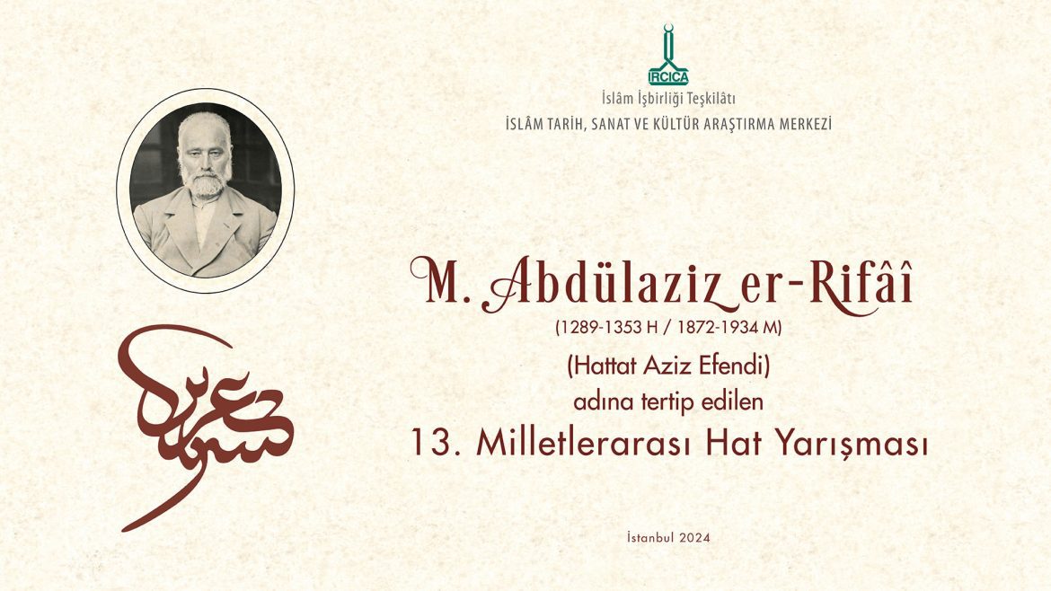 IRCICA, üç yılda bir defa düzenlediği Milletlerarası Hat Yarışması’nın 13.sünü başlatmış olduğunu duyurmaktan memnuniyet duymaktadır. Bu yarışma Hattat Mehmed Abdülaziz er-Rifâî (1289-1353 H/1872-1934 M.) adına düzenlenmektedir. Yarışmanın gayesi, “klasik İslâm hat sanatı”nın korunması, yaşatılması, geliştirilmesi ve sanatkârların teşvikidir. Dolayısıyla, İslâm kültürü dışından gelen tesirlerle, “klasik İslâm hat sanatı” anlayışı dışında gelişen yaklaşımlar yerine, geleneğe bağlı prensip ve kaideler içinde meydana getirilmiş eserlerin elde edilmesi hedeflenmektedir. Bu maksada ulaşıldığında, sanatkârların çalışmaları için müşterek bir zemin hâsıl olacak ve aynı zamanda İslâm sanatları arasında önemli bir yeri olan hüsn-i hatta dünyada herkesin paylaşacakları ortak bir zevkin tesisi temin edilecektir.