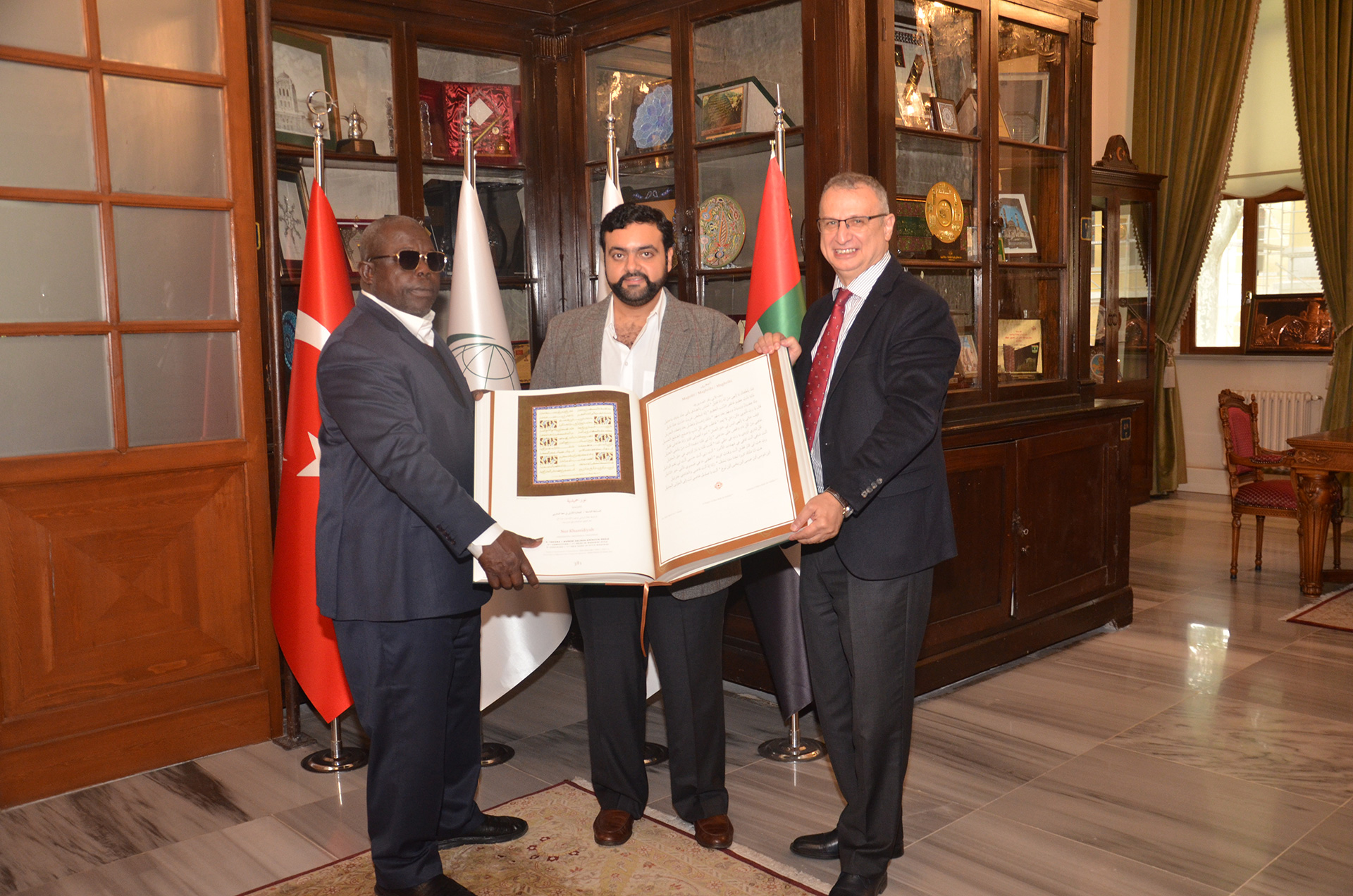 Birleşik Arap Emirlikleri, Füceyre Emirliği Veliaht Prensi Şeyh Mohammed bin Hamad Al Şarki Türkiye’yi ziyaret programı çerçevesinde 18 Kasım 2024’te IRCICA’yı ziyaret etti. Genel Direktör adına Genel Direktör Yardımıcısı Prof. Aboubacar Abdullah Senghore, Araştırma ve Yayınlar Başkanı Prof. Cengiz Tomar ve Sanat Bölümü sorumlusu Sait Kasımoğlu tarafından karşılanan Veliaht Prens ve beraberindekilere Merkezin faaliyetleri ve ana bölümleri tanıtıldı, IRCICA’nın yarışmalarında ödül kazanmış hat eserlerinin sergisi gezdirildi.
