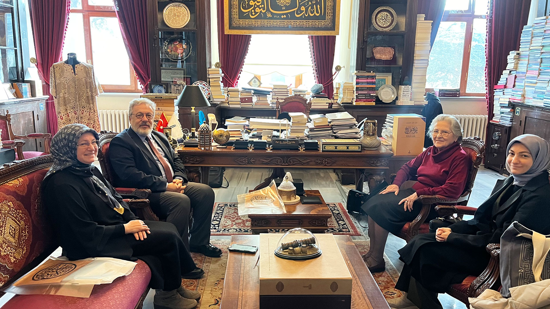 Genel Direktör Prof. Mahmud Erol Kılıç 24 Ocak 2024’te Tezhip sanatı hocaları İnci Ayan Birol ve Ayten Tiryaki’yi IRCICA’da kabul etti. Görüşmeden sonra hocalar ve beraberlerindeki sanatkârlar IRCICA Sanat Bölümü Başkanı Said Kasımoğlu rehberliğinde IRCICA’nın tezhipli hat levhaları koleksiyonundan örnekleri incelediler.
