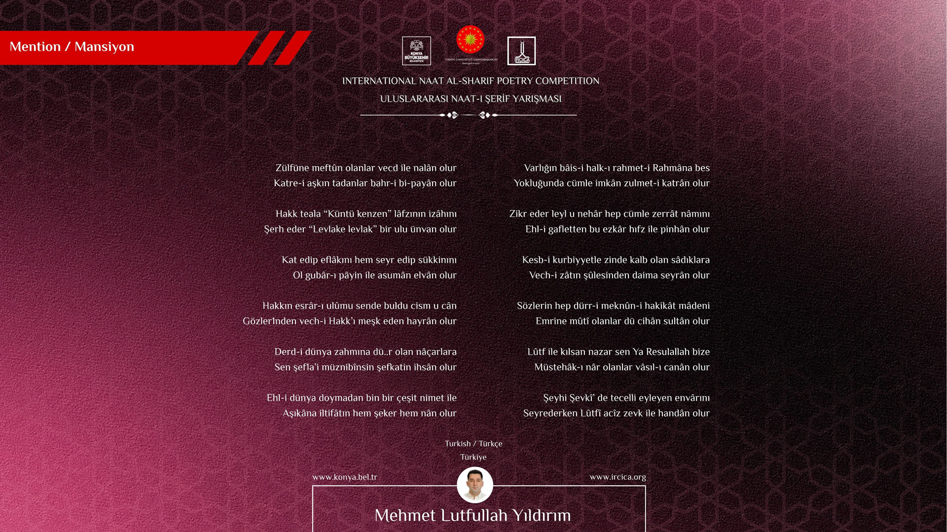 Hz. Muhammed’in (sav) 1500. doğum yıldönümü vesilesiyle IRCICA tarafından İİT Genel Sekreterliği ve Konya Büyükşehir Belediyesi işbirliğiyle T.C. Cumhurbaşkanlığı himayesinde 5 dilde düzenlenen Uluslararası Naat-ı Şerif Yarışması’nın sonuçları, 17 Aralık 2025’te Konya’da yapılan törenle açıklandı. Ödüller Konya Büyükşehir Belediye Başkanı Sn. Uğur İbrahim Altay ve IRCICA Genel Direktörü Prof. Mahmud Erol Kılıç tarafından takdim edildi. Birincilik ödülünü Moritanya’dan Muhammed Lemine Şerif Sid El Hadi kazanırken, ikincilik ödülünü Fas’tan İlyas Amharar ve İran’dan Hüseyin İsmaili paylaştılar; üçüncülük ödülünü Endonezya’dan Bagia Putra ile Türkiye’den Kerim Ak paylaştı ve üç mansiyon ödülü Türkiye’den Kenan Yavuzarslan, Yaşar Bayar ve Mehmet Lütfullah Yıldırım’a verildi. Bu vesileyle Hz. Muhammed’in (sav) kutlu Siret’ini temsil eden resimlerden oluşan bir sergi açıldı. Tören yarışmanın anlamına uygun bir dönemde, 752. Şeb-i Arus kutlamalarının manevî atmosferinde gerçekleşti.